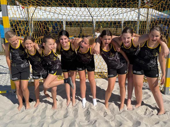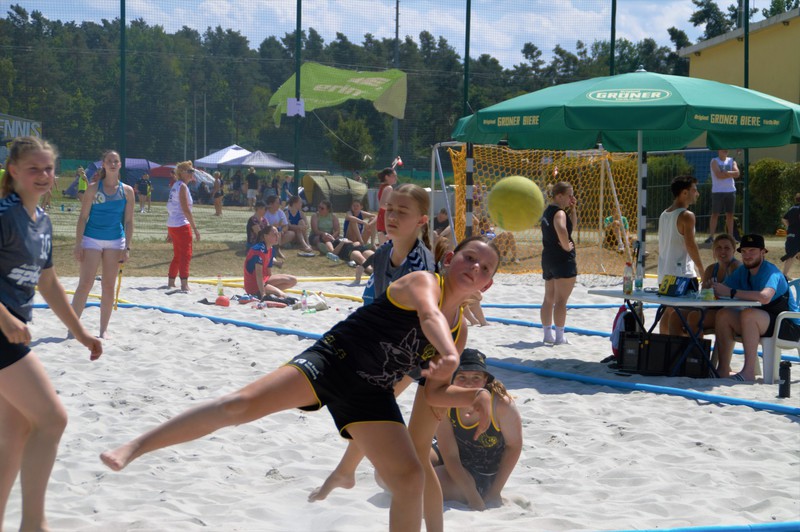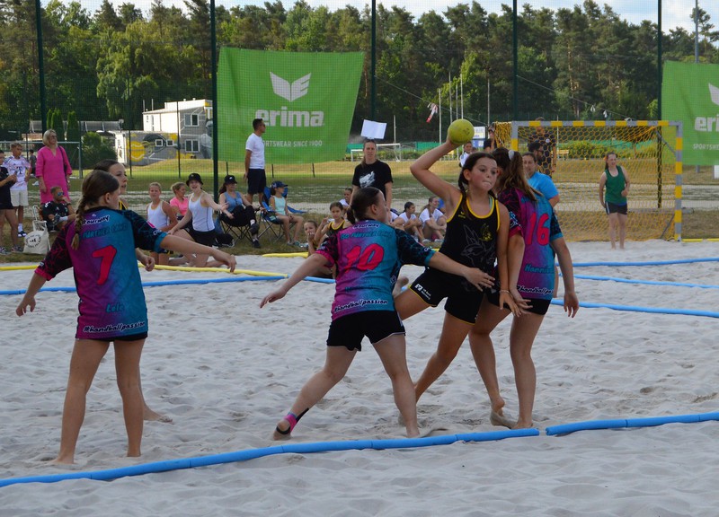 Im zweiten Spiel hatten wir starke Mädels gegen uns. Diese nahmen uns auch die erste Halbzeit ab. Nicht aufgeben lautet unser Motto und wir erkämpften uns ein Unentschieden in der zweiten Hälfte. Das geht im Beachhandball nicht, so muss die Halbzeit mit Golden Goal entschieden werden. Das heißt, der erste Punkt der erzielt wird gewinnt die Halbzeit. Beide Mannschaften hatten mehrere Angriffe. Wir konnten vorne nicht sicher verwandeln, aber unsere Abwehr und unsere Torhüterinnen hielten uns im Spiel. So erkämpften wir uns nach 5 Minuten unseren letzten Angriff und netzten zum Halbzeitgewinn ein. Ohne Shoot Out stand es nun 1:1.